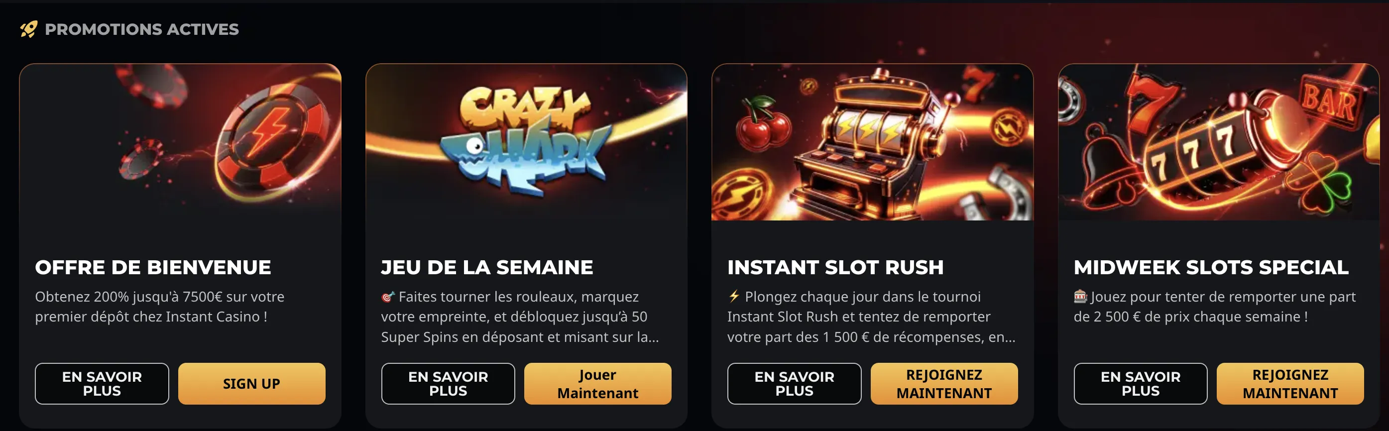 Les machines à sous occupent généralement la plus grande part du catalogue d’Instant Casino, avec une offre construite autour de jeux récents, de jackpots, de mécaniques bonus et de niveaux de volatilité différents, ce qui permet au joueur de choisir entre sessions plus stables ou formats à gains potentiellement plus élevés; l’intérêt pratique repose surtout sur la diversité des thèmes, la lisibilité du RTP, souvent situé entre 94 % et 97 %, et la présence de mises adaptées aussi bien aux petits budgets qu’aux profils plus actifs.